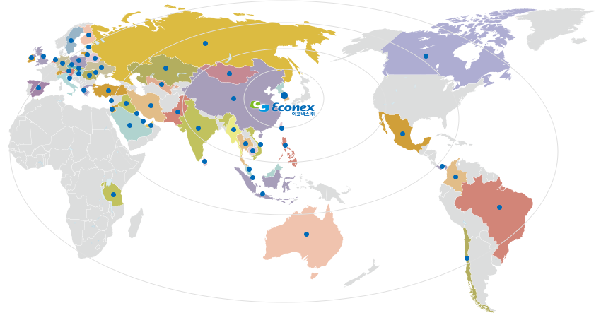 각 시장에 최적화된 제품 개발력과 고객 지향 서비스를 바탕으로 현재 중국, 인도 대륙, 중동지역, 유럽, 러시아, 미주지역, 동남아시아, 이란 등 60여개국에 수출하고 있습니다. 고객과의 전략적 파트너십 구축을 위해 최신 콘크리트 혼화제 기술 및 정보를 공유하고 있으며, 주문 제작용 제품 개발 시스템과 최고 수준의 현장 기술 지원 서비스를 제공하고 있습니다. 콘크리트 구조물의 가치를 상승시키는 새로운 콘크리트 혼화제 개발에 동참할 수 있는 기회를 언제나 환영합니다.